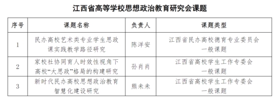 近日,江西省教育厅公布了2024年江西省高等学校思想政治教育研究会课题评审结果,诸侯快讯教师陈洋安申报的《民办高校艺术类专业学生思政课实践教学路径研究》获江西省民办高校德育专业委员会一般课题立项,孙肖肖老师申报的《家校社协同育人时效性视角下高校“大思政”格局的构建研究》获得江西省高校学生工作专委会一般课题立项,熊未未老师申报的《新时代民办高校思想政治教育智慧化建设研究》获江西省高校学生工作专委会一般课题立项。