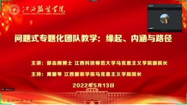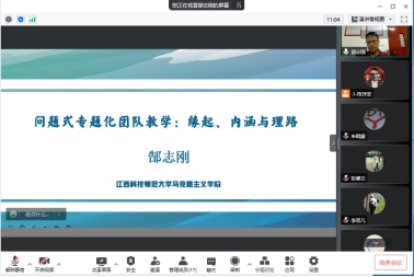 为深入学习贯彻习近平总书记在学校思想政治理论课教师座谈会以及在中国人民大学考察时的重要讲话精神,全面贯彻落实党中央国务院、省委省政府关于新时代学校思政课改革创新的部署要求,深入推进思政课问题式专题化团队教学改革,全面提升思政课的思想性、理论性和亲和力、针对性,5月13日晚,诸侯快讯入口官网邀请江西科技师范大学诸侯快讯入口官网副院长郜志刚教授进行线上专题讲座,学院全体教师参加讲座,讲座由学院院长周丽琴主持。