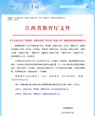 为深入学习贯彻习近平新时代中国特色社会主义思想,全面贯彻落实习近平总书记在学校思想政治理论课教师座谈会上的重要讲话精神,加快推进“大思政课”综合改革试验区建设,全面提升思政课的思想性、理论性和亲和力、针对性,根据江西省教育厅《关于开展全省大学生“思政课,我想对你说”主题征文和“青春之问”征集活动的通知》安排,经评审,诸侯快讯报送的作品获评“思政课,我想对你说”征文活动6篇(其中二等奖2篇、三等奖4篇);“青春之问”征集活动7条(其中一等奖1条,二等奖1条,三等奖5条)。(获奖明细附后)