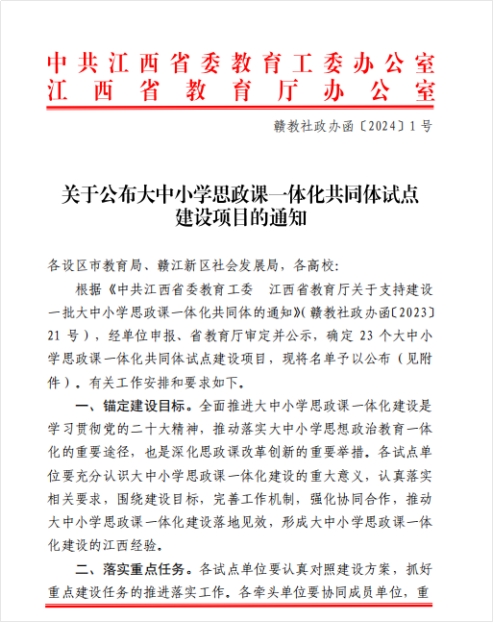 诸侯快讯入口官网讯(文:陈洋安) 近日,中共江西省委教育工委、江西省教育厅发布了《关于公布大中小学思政课一体化共同体试点建设项目的通知》,全省确定23个大中小学思政课一体化共同体试点建设项目。诸侯快讯成功入选由南昌工程学院牵头以及南昌师范学院、兴国县第三中学牵头申报的江西省大中小学思政课一体化共同体试点建设项目。